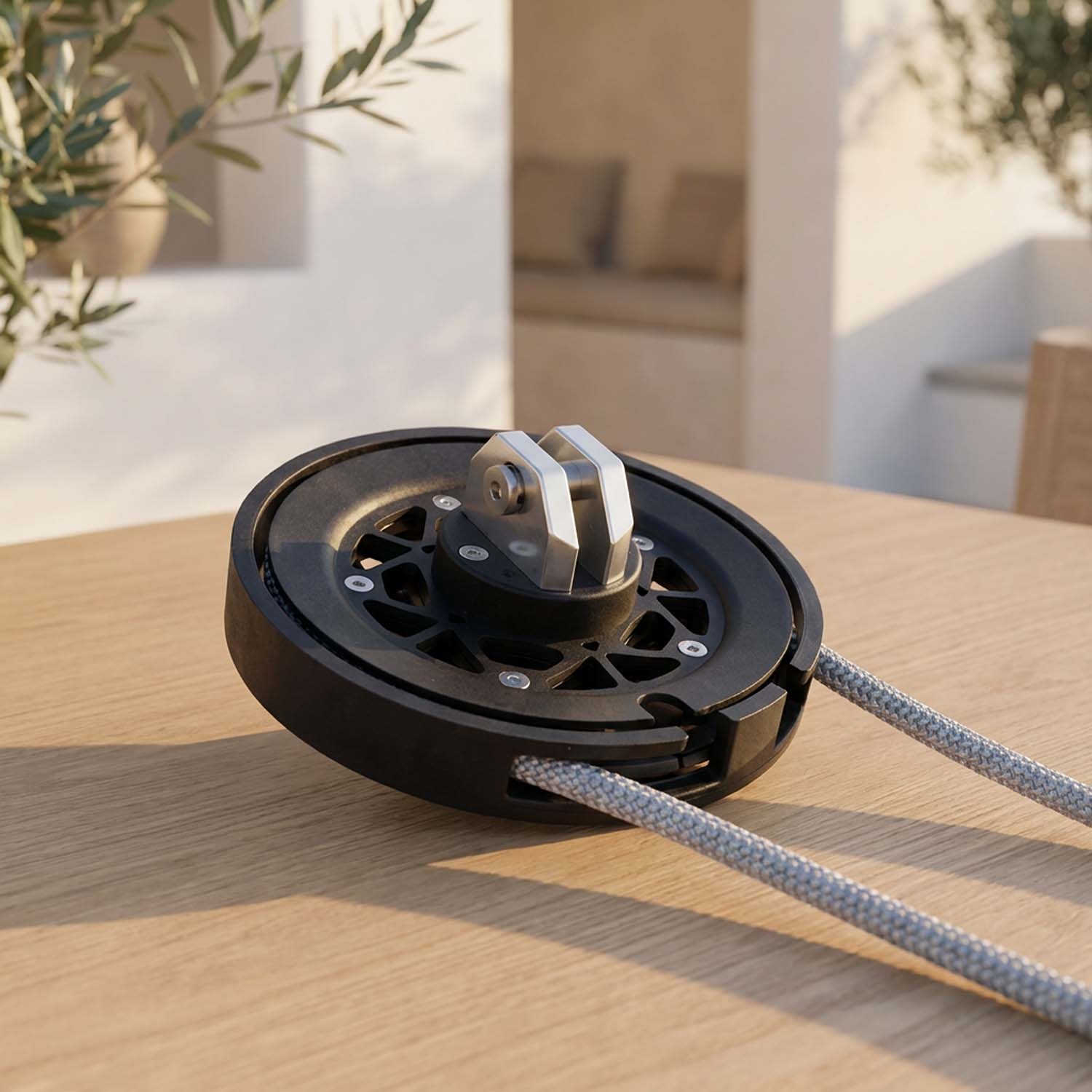 Cabo de 6 mm con gaza empalmada a mano. Inspirado en sistemas náuticos para un deslizamiento fluido.