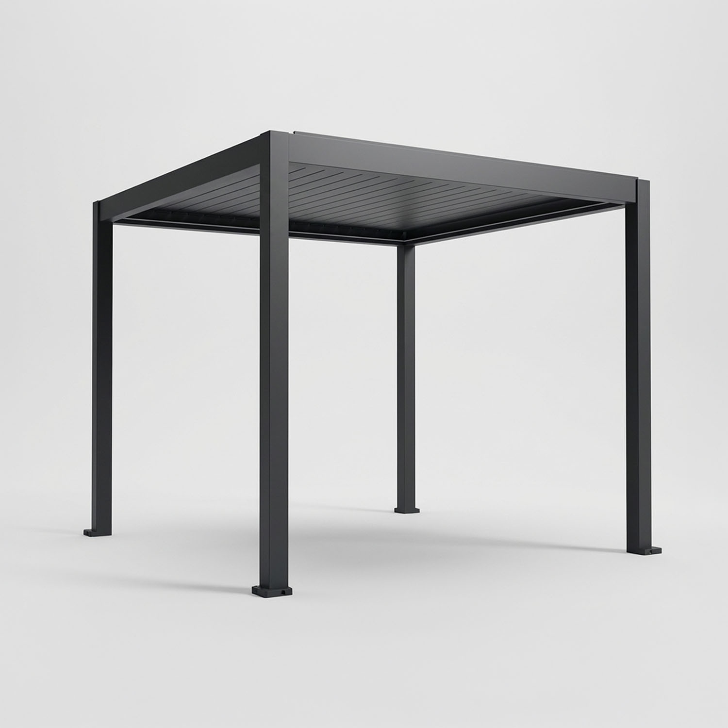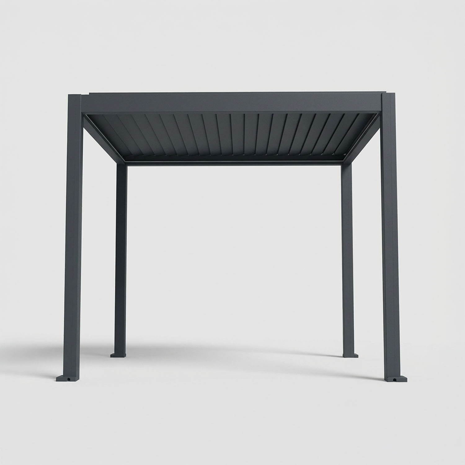 Postes de 120×120×2 mm con doble canal, vigas de 160×95×1,7 mm con canalón integrado y lamas de 160×33×1,4 mm. Todo en aluminio 6063-T6 con recubrimiento en polvo resistente a los rayos UV en el color elegido.