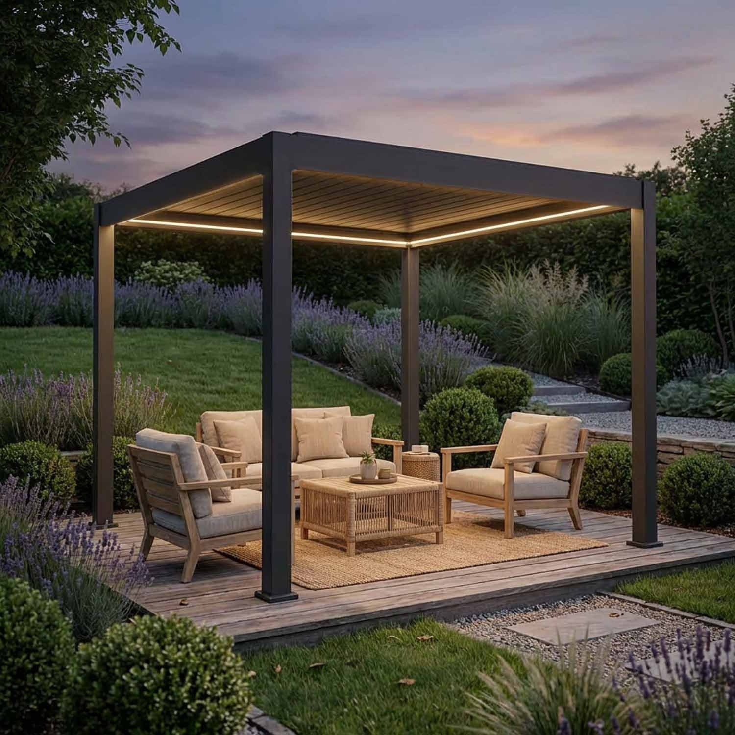 Sí, y es el contexto en el que se instala la mayoría de nuestras pérgolas. La dimensión mínima de 3 × 3 m se adapta a terrazas medianas y grandes, mientras que los formatos de hasta 4 × 6 m son ideales para jardines o espacios exteriores de villas. Lyra T6 está diseñada para un uso residencial continuo: la garantía de 10 años en la estructura refleja esta expectativa de durabilidad.