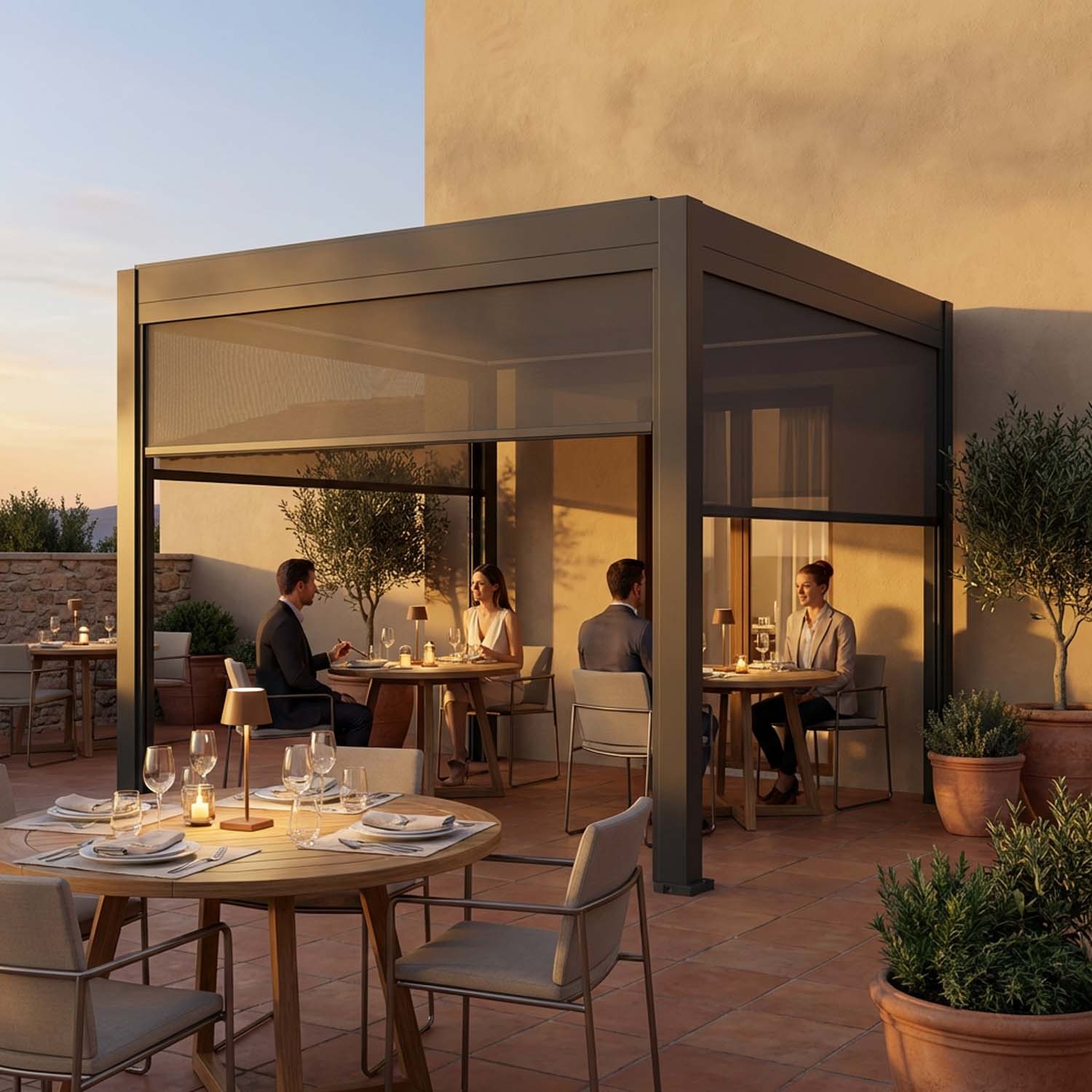 Alarga la temporada outdoor durante meses. Protección contra insectos en cenas de verano y barrera contra el viento. Los clientes se quedan, las mesas se llenan.