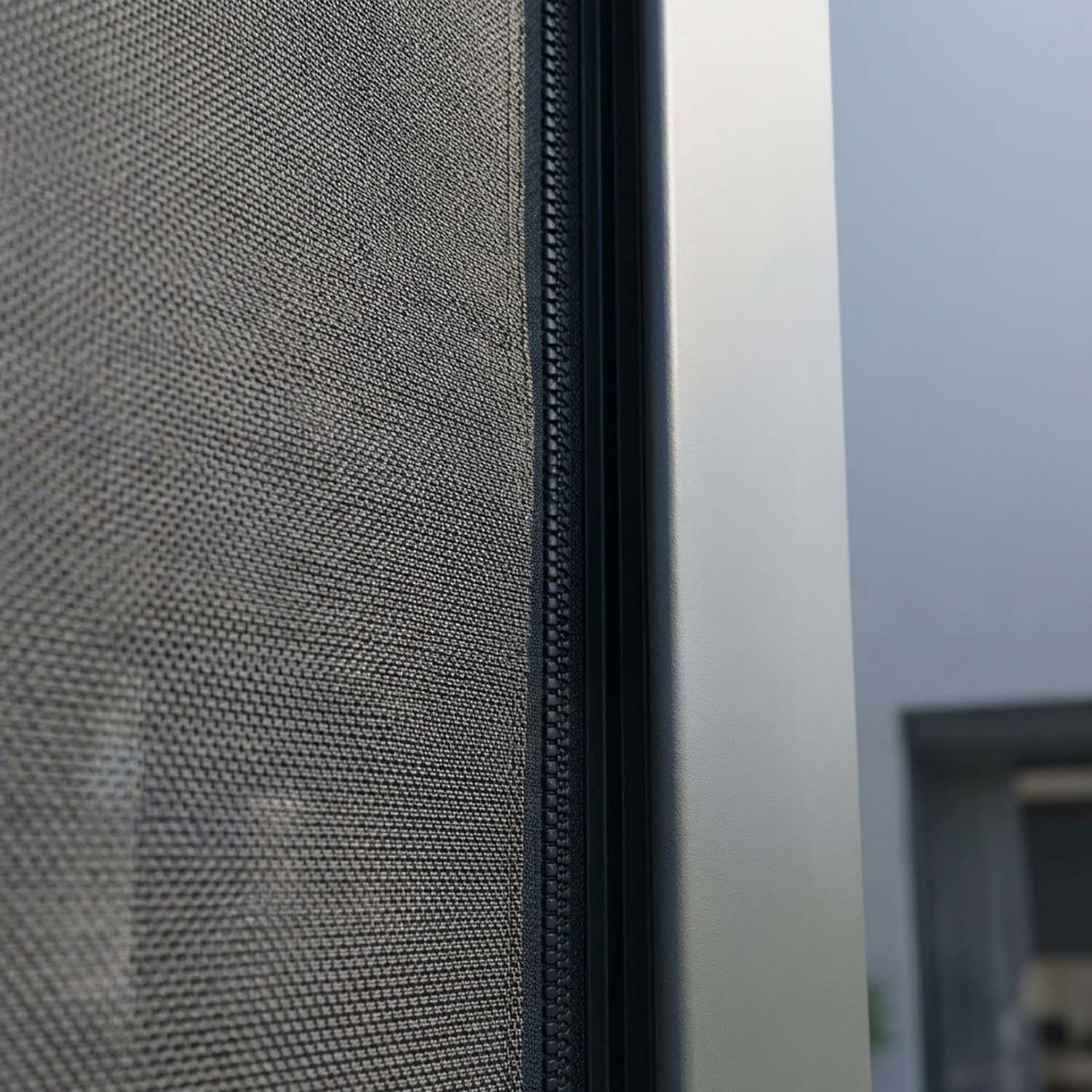 Un toldo a caída tradicional tiene los laterales libres: se infla y golpea con el viento, deja huecos para los insectos y no es eficaz como barrera térmica. La ZIP Screen cuenta con una cremallera que se desliza en guías laterales cerradas: el tejido queda bloqueado en todo el perímetro, no se mueve con el viento y no deja aperturas.