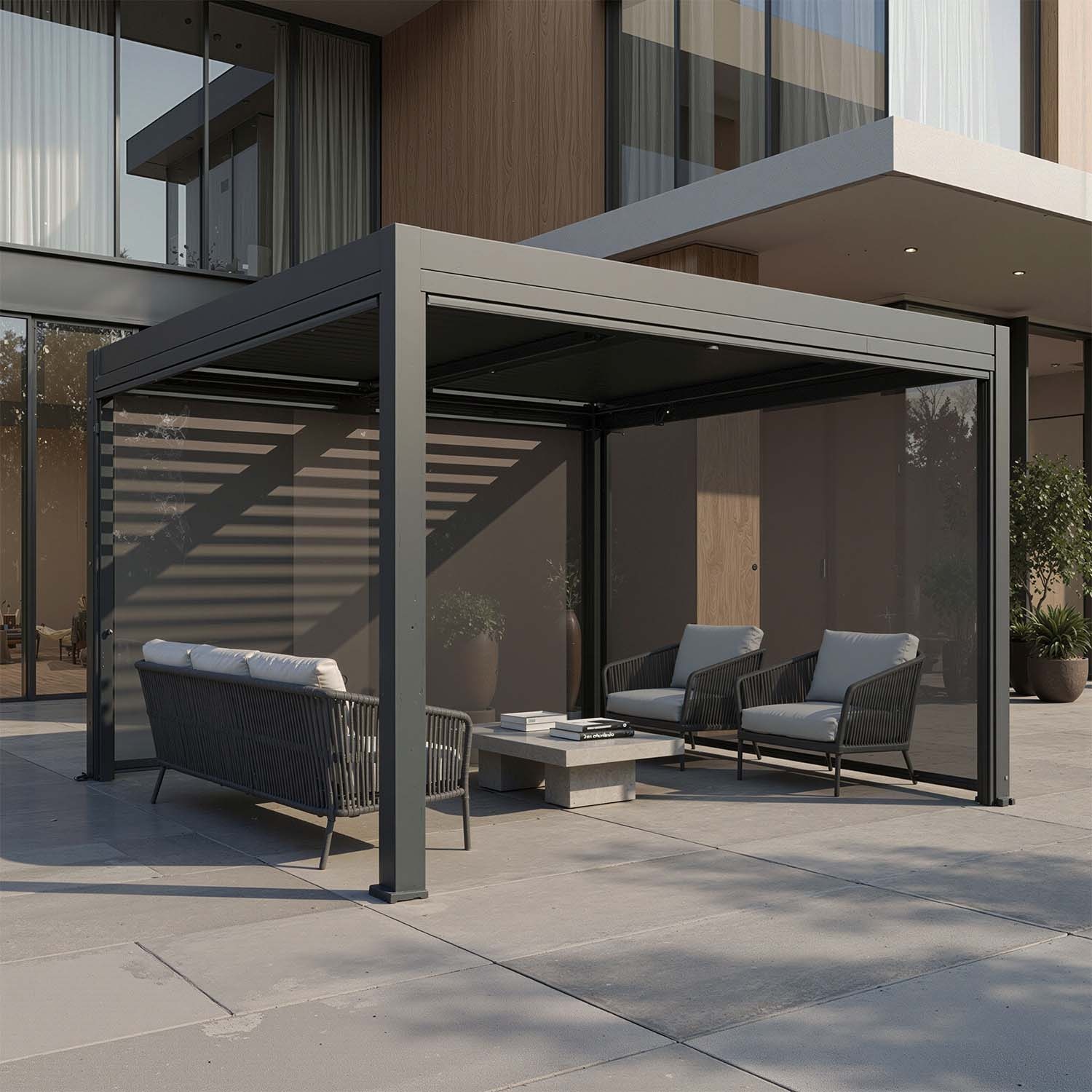 Una pérgola sin cierres laterales es un techo. Con la Manual Zip Screen se convierte en una habitación. El sistema ZIP con guía lateral en aluminio T6 mantiene el tejido bloqueado en toda su altura: no se infla, no golpea, no cede.