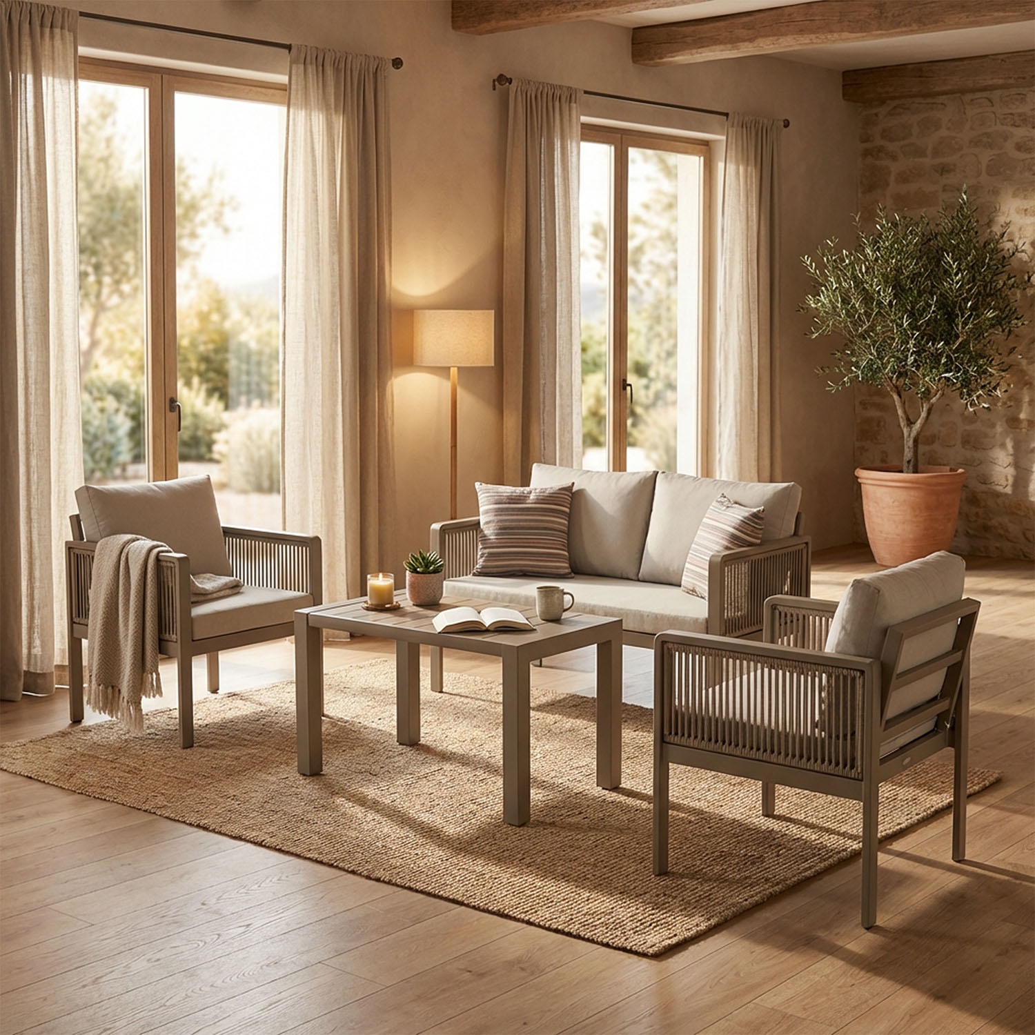 Sí. El tono topo y la cuerda en color neutro hacen que Genova sea adecuado también para verandas, porches y espacios interiores. No necesitas versiones separadas: es el mismo set para ambos usos.