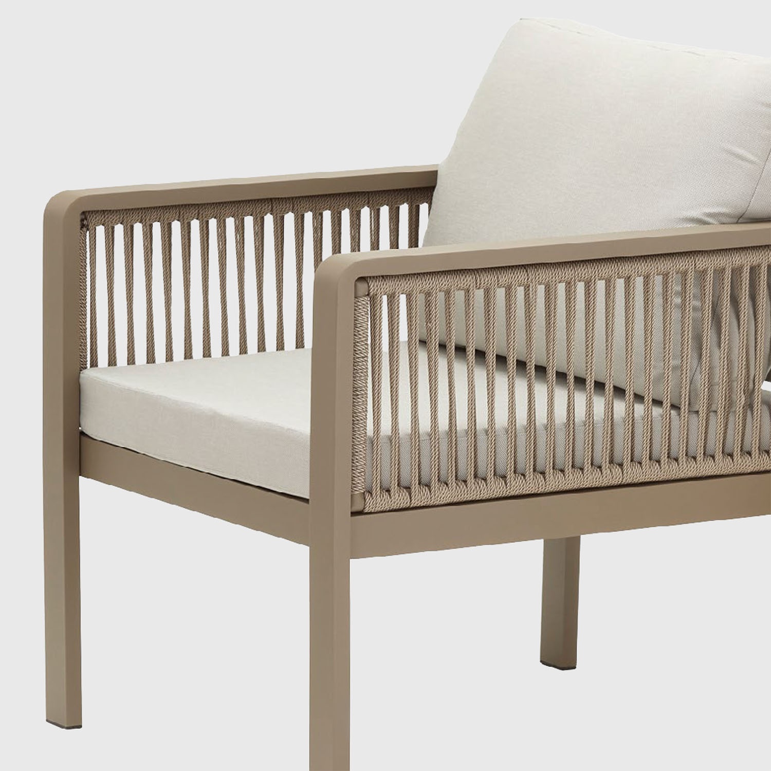 Estructura de aluminio color topo con cuerda de olefina trenzada a mano. Dimensiones 130×67×74 cm. Incluye cojín de asiento y cojín de respaldo en Olefina color arena.