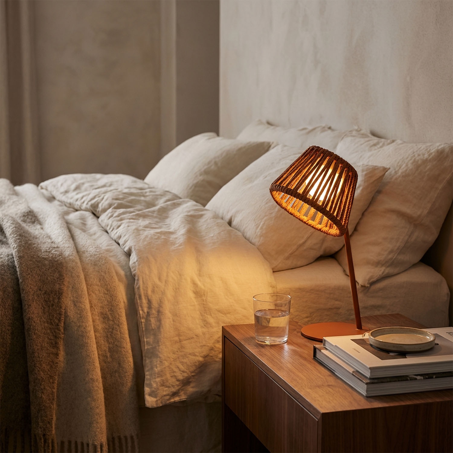 Luz cálida para leer. Se recarga en la mesita de noche durante el día.