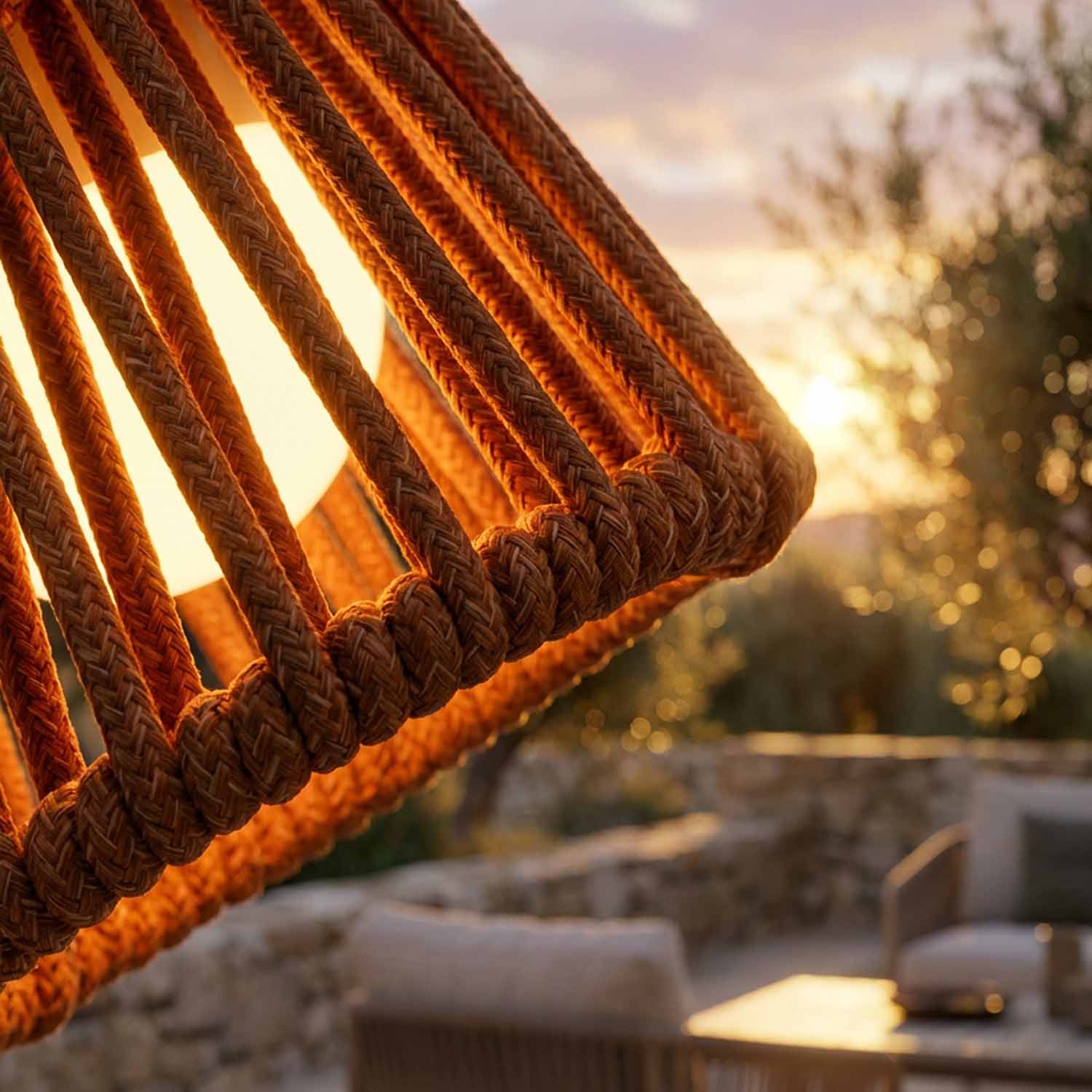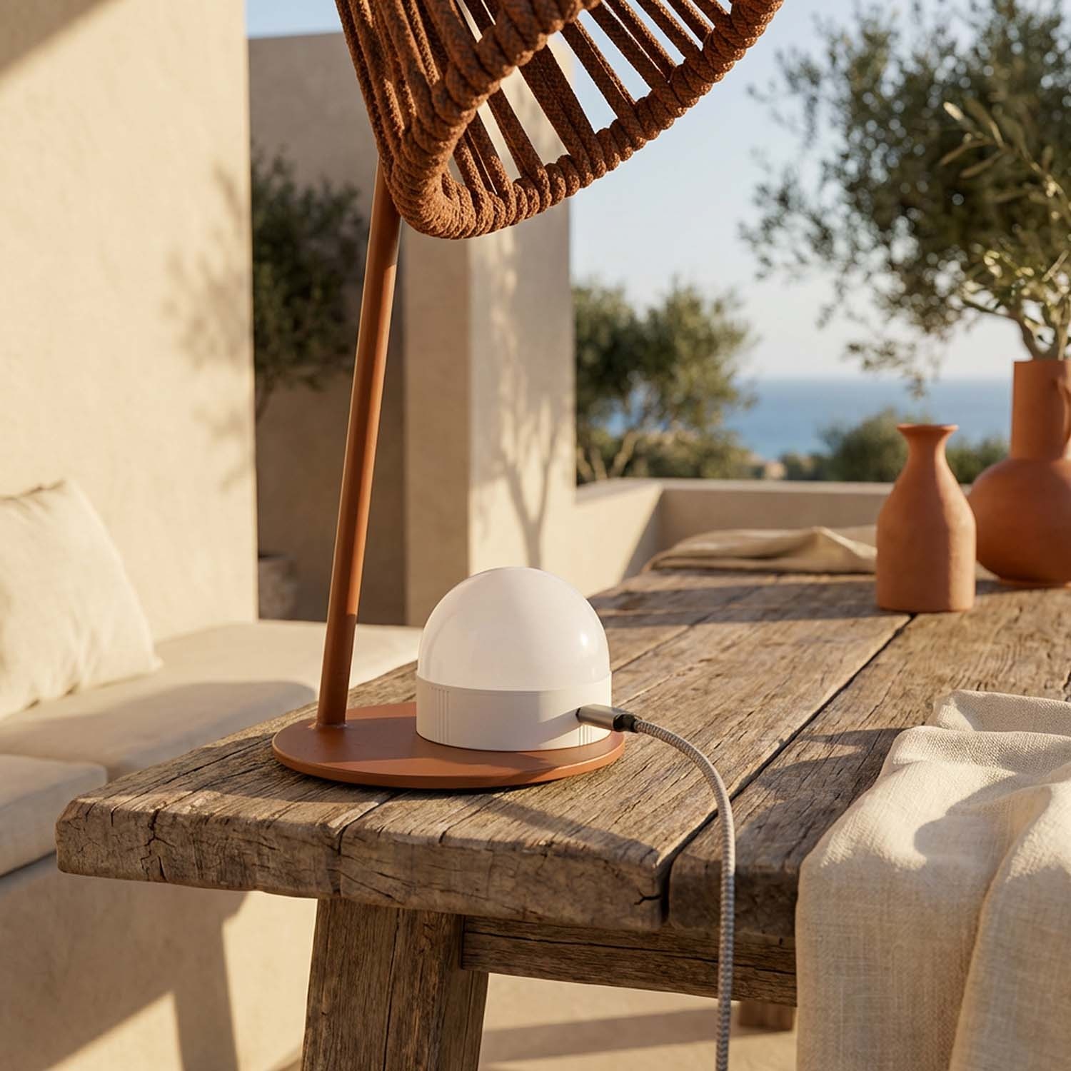 Mini Ropelle está diseñada para uso mixto interior/exterior. Es perfecta para terrazas cubiertas, pérgolas, mesas de jardín, pero también para el salón, el escritorio o la mesita de noche. Gracias a su protección IP44, resiste las salpicaduras de agua, pero no es apta para la exposición directa a lluvias intensas ni para la inmersión.
