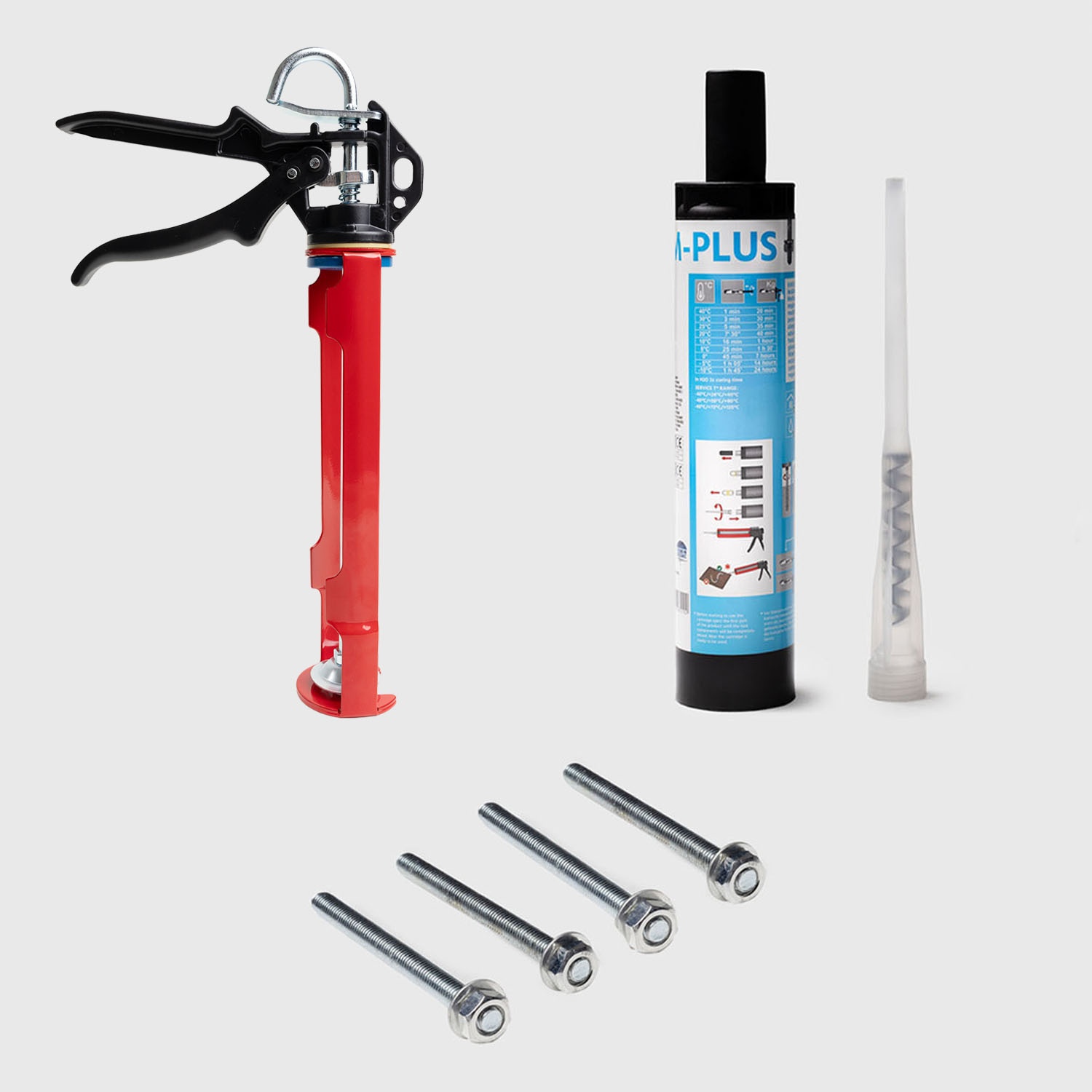 Un poste Maanta mal instalado pone en riesgo toda la estructura. Este kit reúne los tres elementos necesarios para una fijación profesional: las barras roscadas M12 de acero galvanizado, el mortero de inyección M-Plus sin estireno y la pistola G2000 para una aplicación precisa.