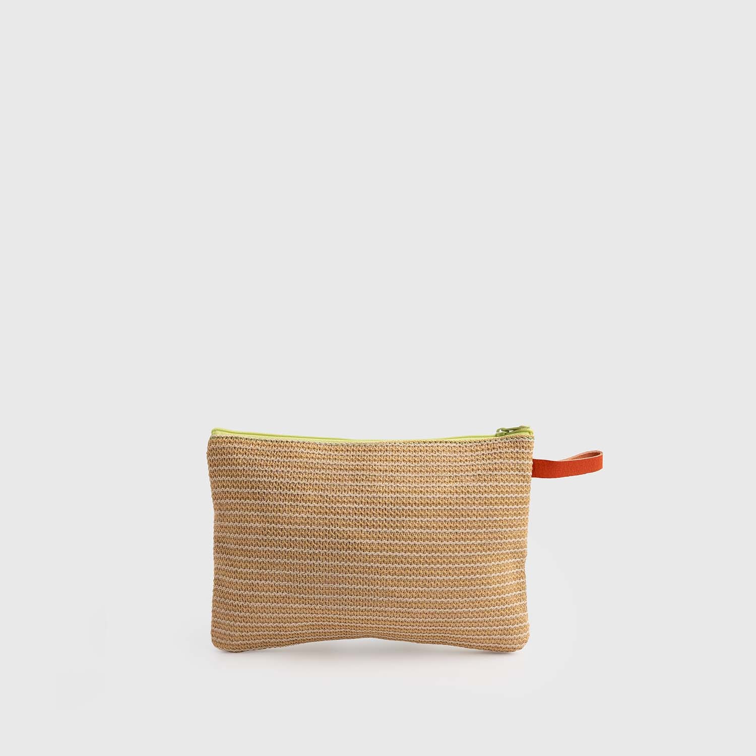 Clutch realizado con la fórmula del reciclaje creativo, bicolor con detalles en verde, azul y naranja con cierre cremallera en la parte superior.
