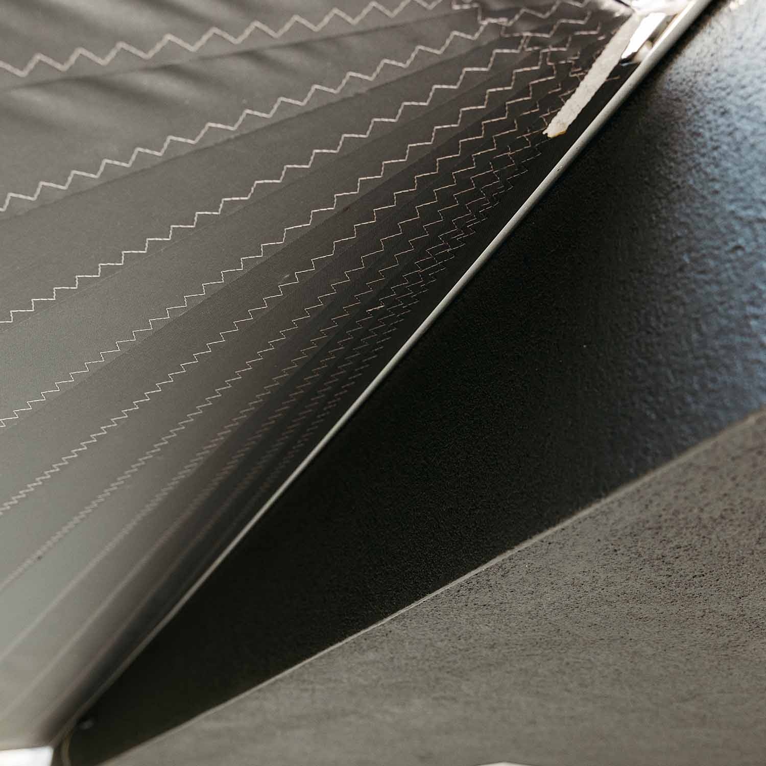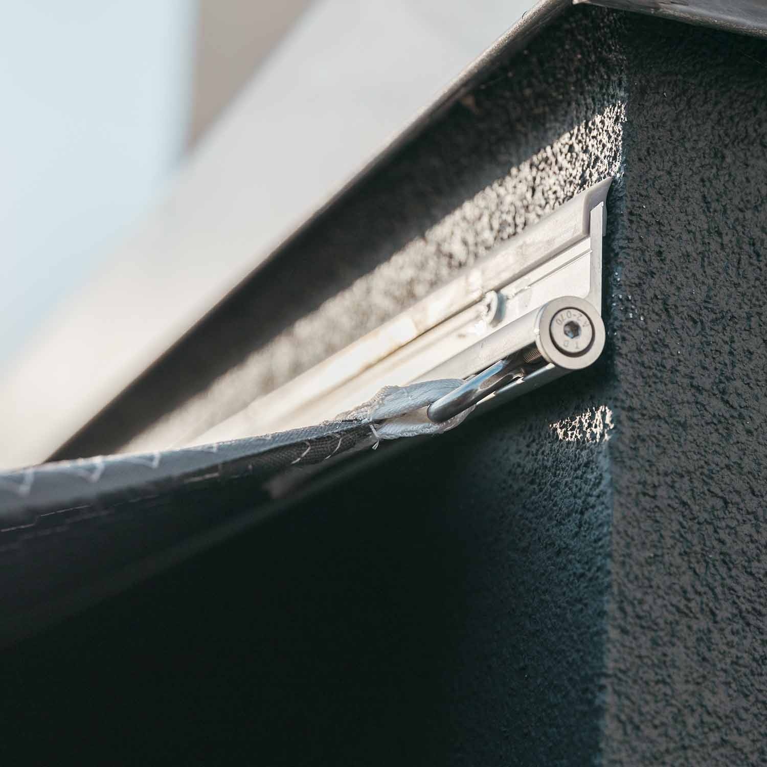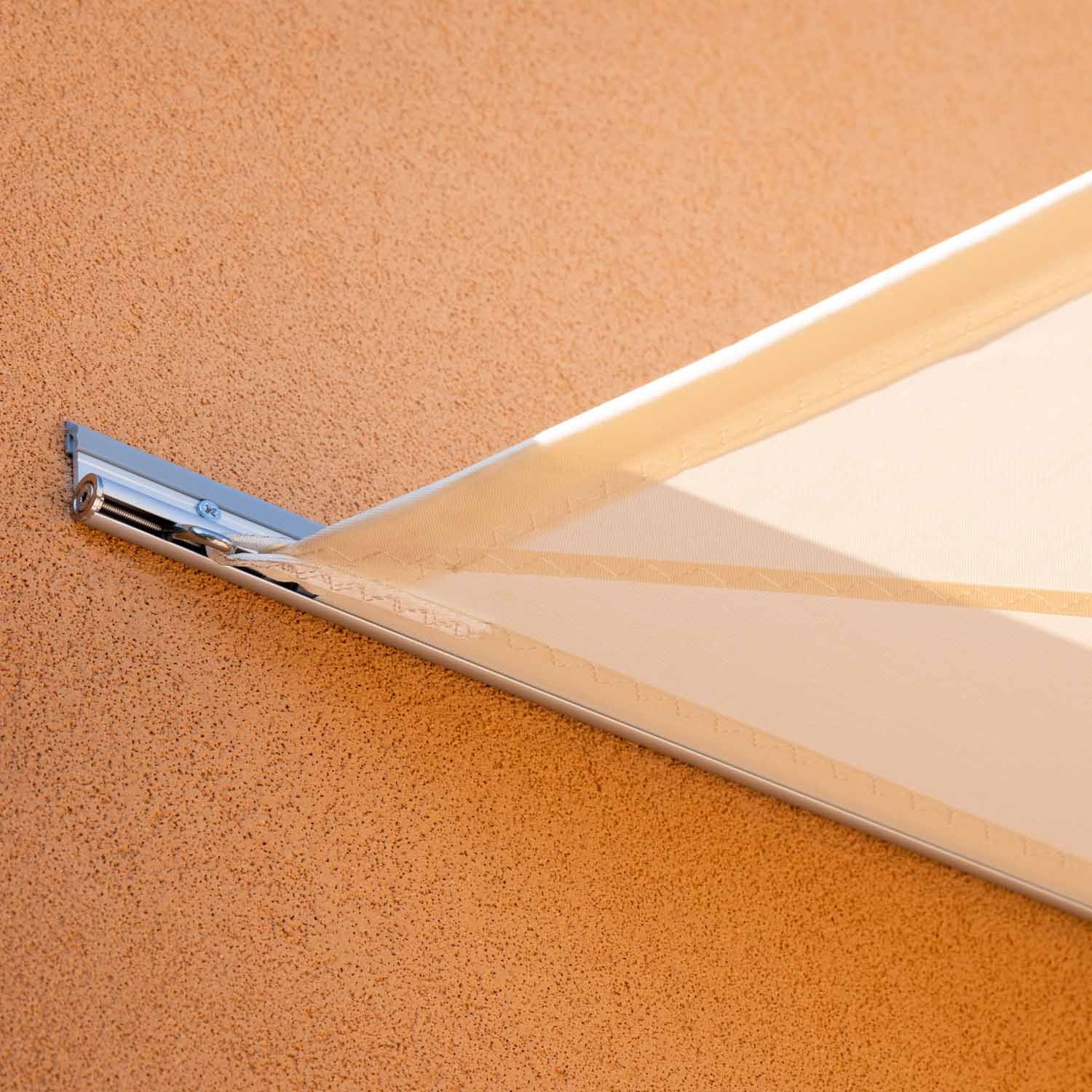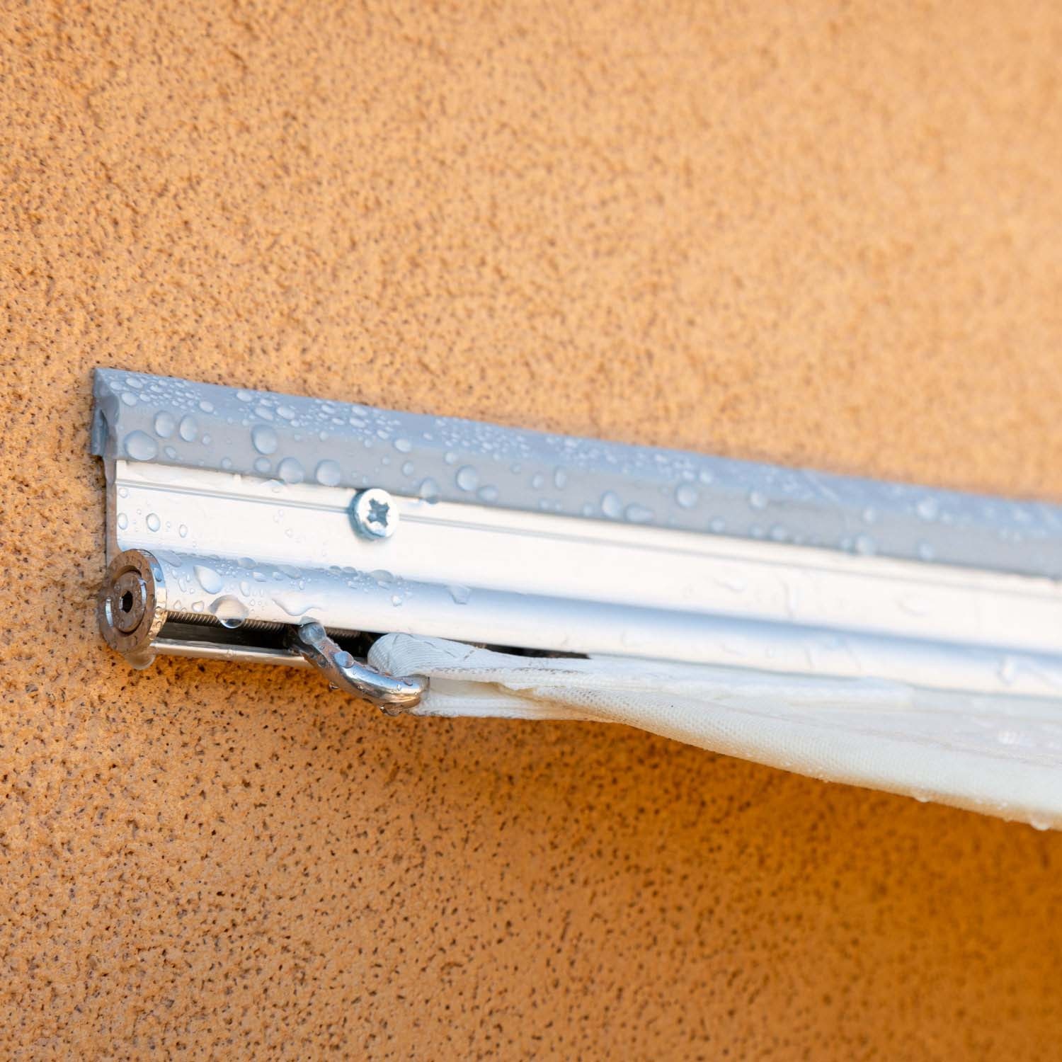 El perfil de aluminio fijado sobre todo un lado de la vela, no permite que el agua de la lluvia pase entre la vela y la pared.
