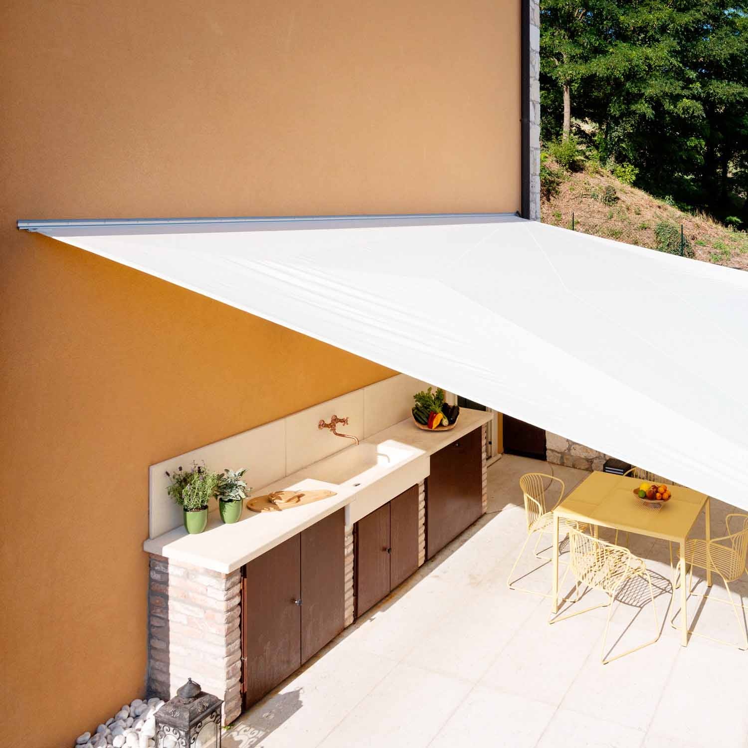 De este modo, el anclaje de dicho lado a una pared exterior, garantiza la completa protección contra las infiltraciones de las gotas de agua y proporciona un máximo confort incluso en caso de fuertes lluvias