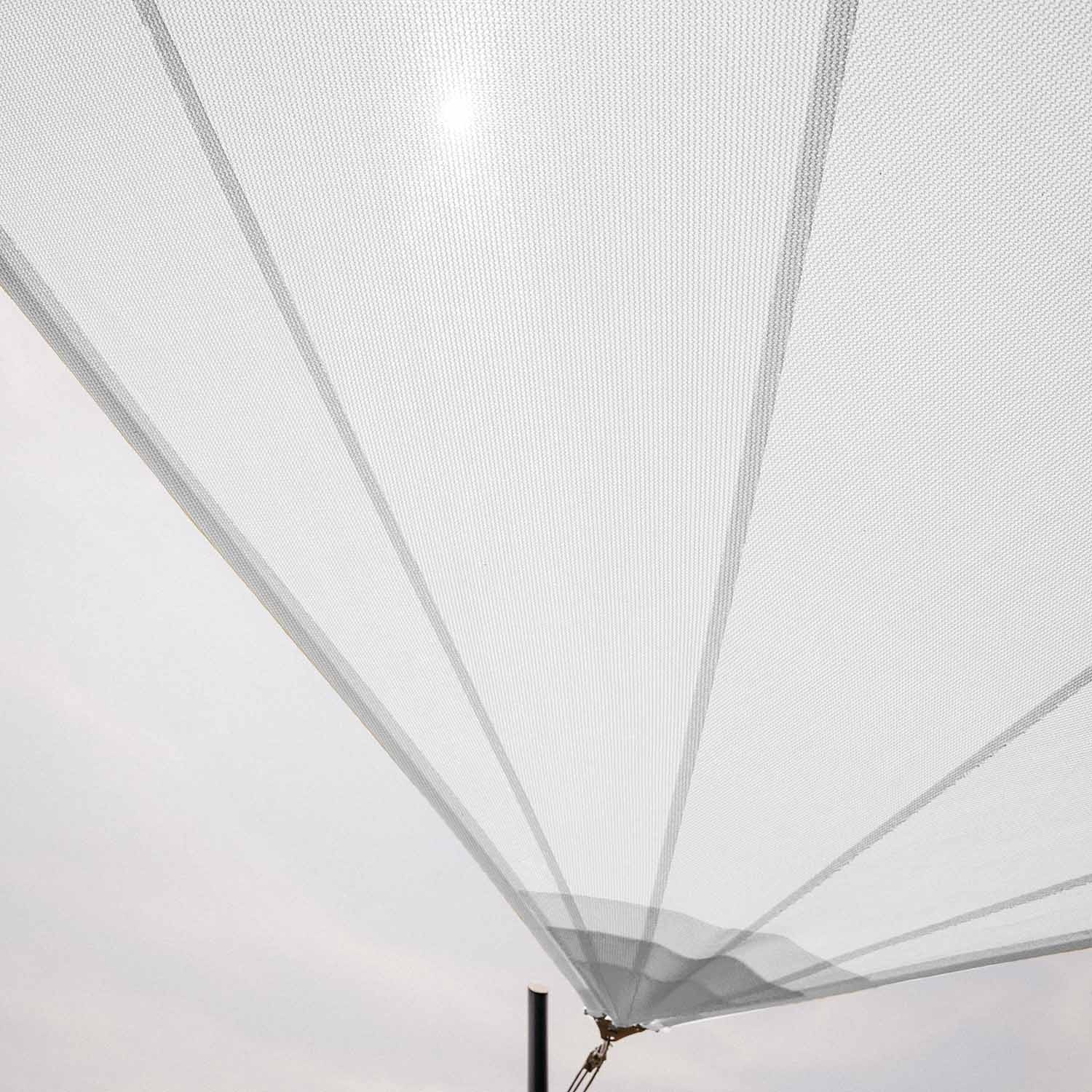 Solaria Transpirable es una vela de sombra de corte radial fabricada con tejido Meshnet® HDPE 320 transpirable que repara del calor intenso y el granizo, y protege contra la radiación UV y los fuertes viento.