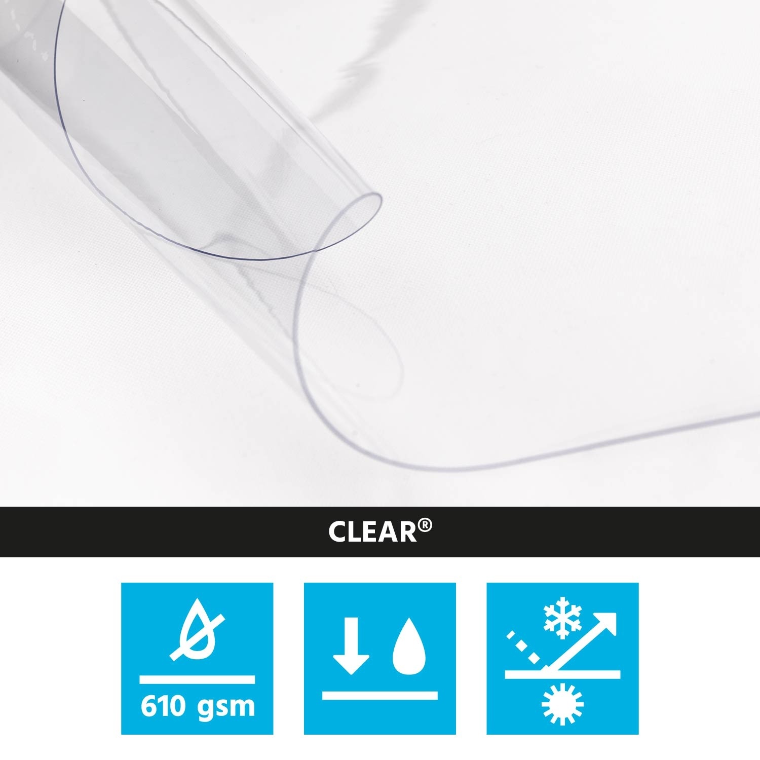 Película de resina de PVC transparente. Extremadamente ligero, resistente a la intemperie y a los rayos UV. El Clear® es también un excelente aislante térmico y no contiene sustancias químicas nocivas.