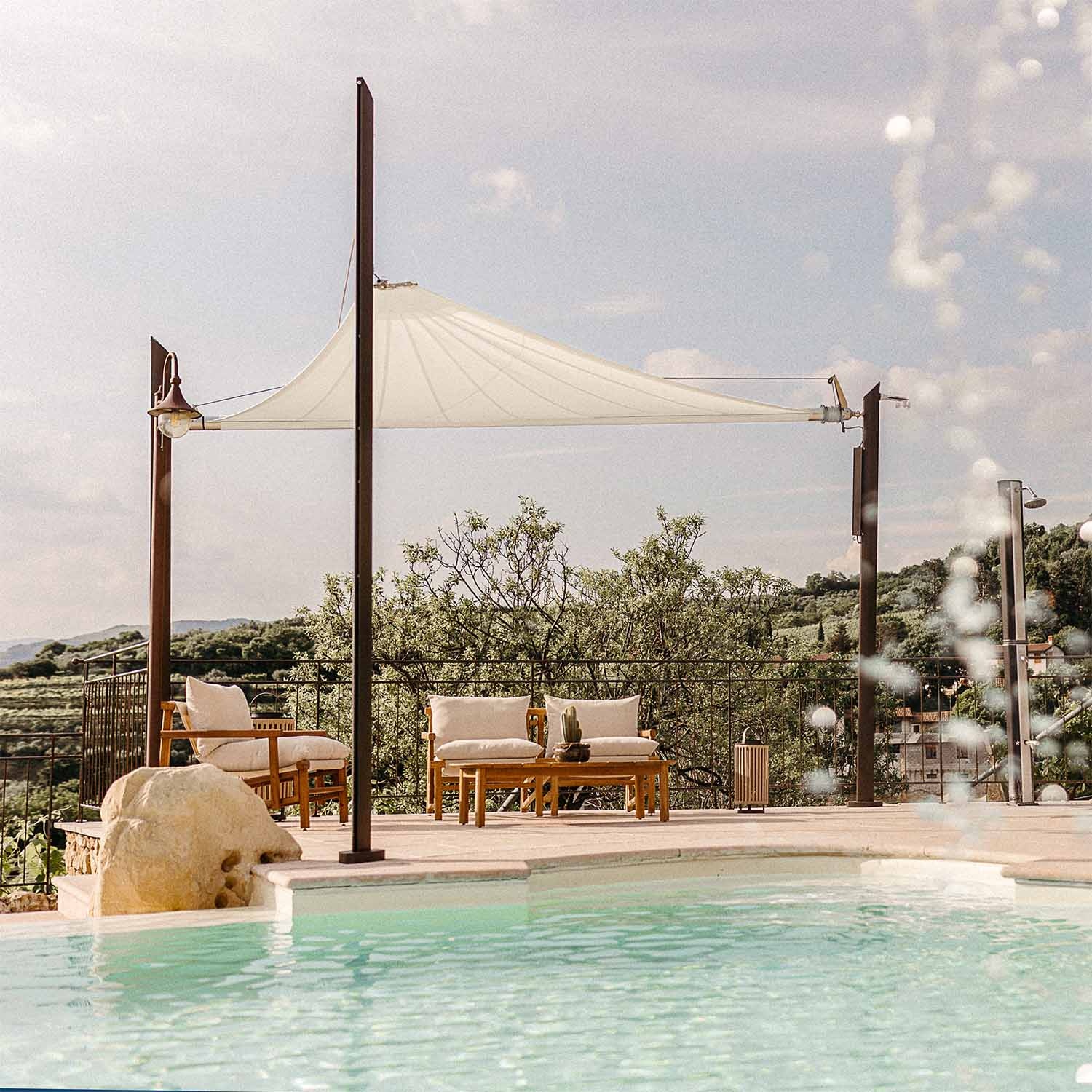 Este toldo vela motorizado requiere postes diseñados específicamente por Maanta, con placas compatibles con su sistema de fijación motorizado. Si ya tienes otros postes, lamentablemente no podrás utilizarlos con Zefira.